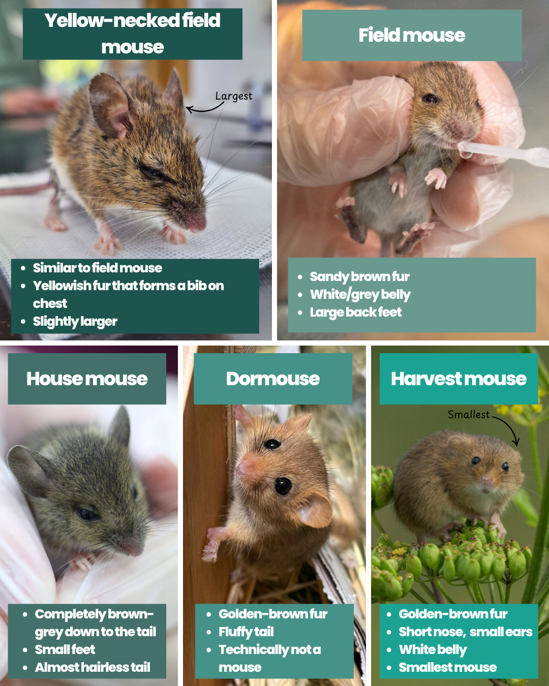 Next time you’re looking at a small furry friend, use our ID chart to work out who you’re looking at. From the largest, the yellow-necked mouse, down to the UK’s smallest, the harvest mouse.