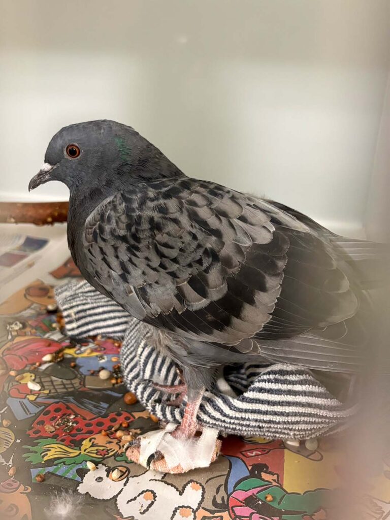 This pigeon was brought to our care after suffering wounds to his left flank and knee. There were no obvious fractures to his leg, however, is was suspected he wasn’t using it, due to the pain he suffered elsewhere.